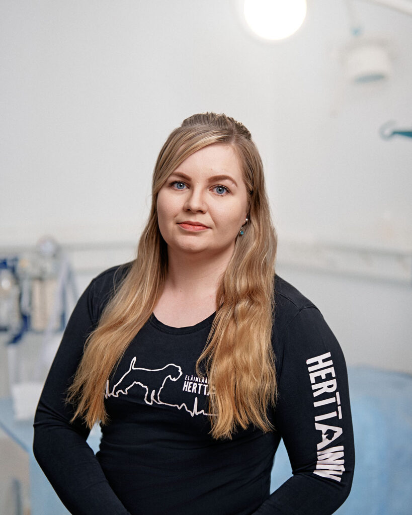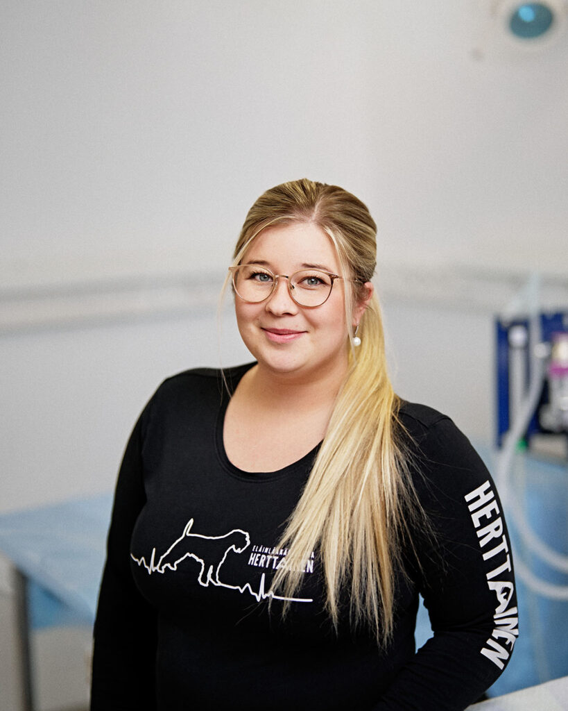 Olen valmistunut klinikkaeläinhoitajaksi vuonna 2021 ja aloittanut työt Herttaisessa 2024. Suurimmat kiinnostukseni kohteet ovat akuuttipotilaat sekä anestesiat. Useimmiten minut löytääkin leikkaussalista tai hammashuoneesta varmistamasta, että potilaat saavat katsella kauniita unia sillä aikaa, kun eläinlääkäri ahkeroi. Kotona meillä asustaa lemmikkejä aina liskoista lapinlehmiin saakka, joten erikoisemmatkaan eläimet eivät jännitä minua.